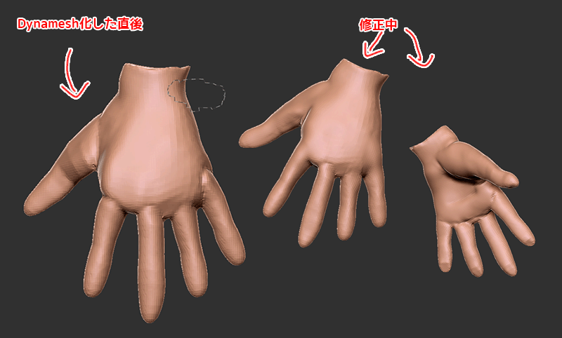 本来であればメッシュの接合部分が良い感じに肉付き表現に活かせるようですが、私の場合、配置の悪さや調整不足のままDynamesh化したので、かなり修正が必要です。