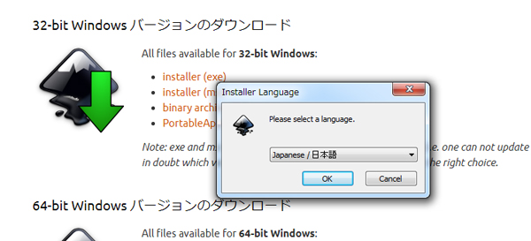 使っているシステムからインストーラーをDL。Windowsの場合32bit/64bitを選べる