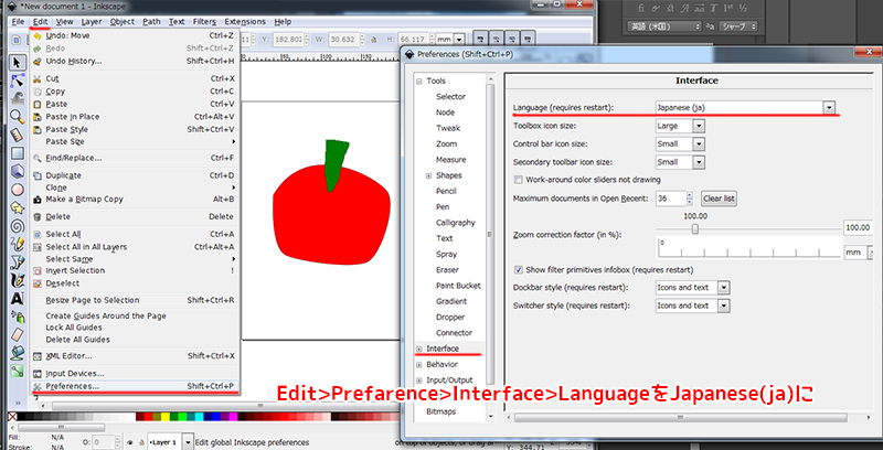Edit>Prefarence>Interface>LanguageをJapaneseにし、InkScapeを再起動するとすると言語変更されるよう。