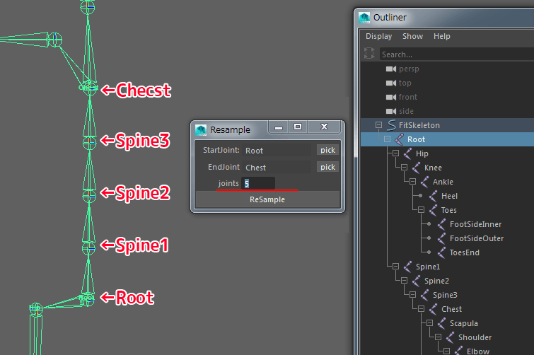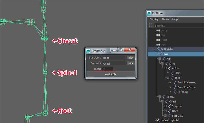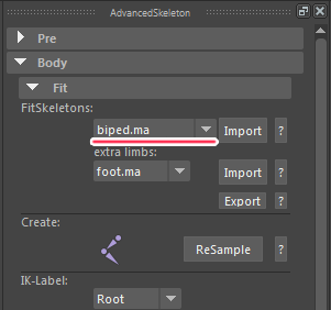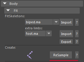 Rootジョイントを選択した状態で、Body>Fit>Cretate:Resampleをクリックします。
