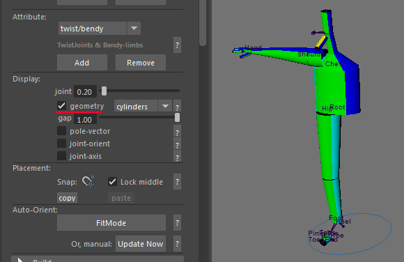 また、デフォルトでは変更を加えてもpole-vectorはリアルタイムに変更されないため、Body>Fit>Auto-Orient:FitModeをONにします。