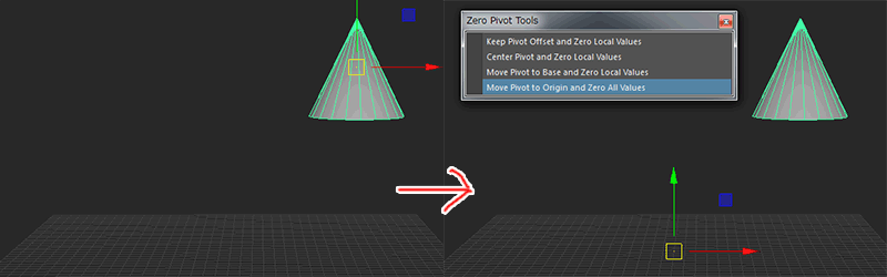 標準機能ではInsertやDキーを押してPivotを編集するモードにして、Gridにスナップ(X)させて原点にと言うような非常に効率の悪い方法を取っていたのですが、BonusTools(Autodesk公式のスクリプト&プラグイン集で、別途DLが必要)内に、Zero Pivot Toolsという1クリックでピボットの位置を変更できる機能があったのでもう少し調べました。