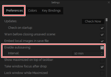 Settings>Prefarences>Enable autosavingに✅を入れます。