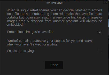 When saving PureRef scenes you can decide whether to embed local files or not. Embedding them will make the save file more portable but it can also result in a very large file. Pasted images or images drag & dropped from another program will always be embedded.