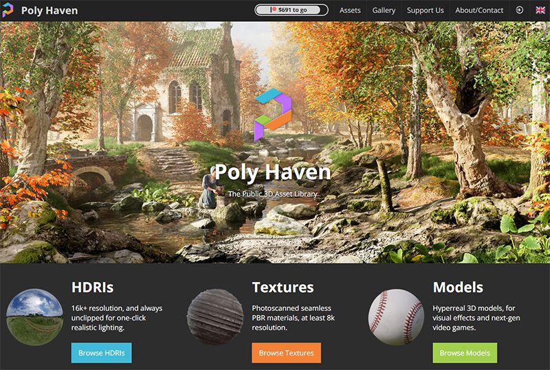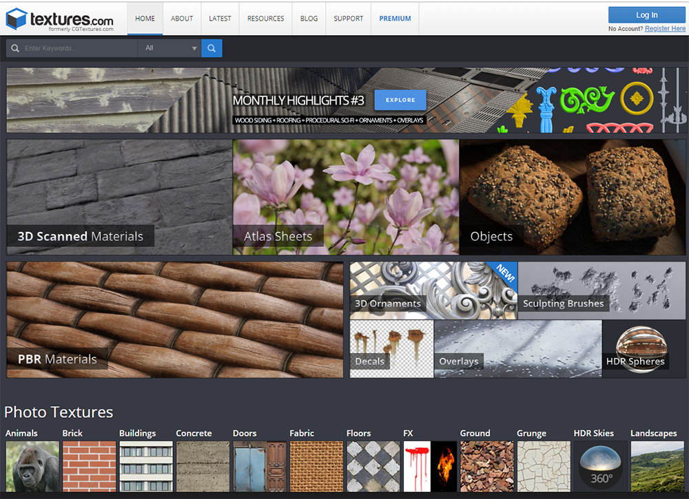 テクスチャからマテリアル、HDRなど様々な素材をDL・販売しているサイトです。