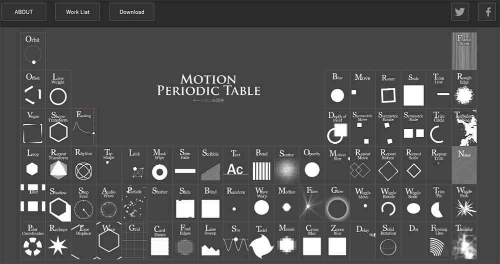 このモーション周期表は、モーショングラフィックスにおける基本要素を抽出し、元素記号表のようにルールをもとに並べたものである。