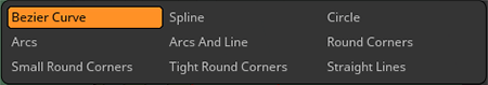 Bezier, Spline, Circle, Arcs, Arcs and Line, Round Corners, Small Rond Corners, Tight Round Corners, Straight Lines:選択したモディファイアに基づいて、2つのポリゴンの間に生成されるジオメトリの形状を定義します。