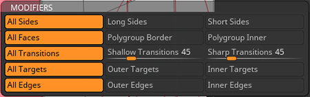 - All Faces(全てのポリゴン)、Polygroup Border(ポリグループの境界)、Polygroup Inner(ポリグループの境界の内側):選択したターゲットの既存のPolyGroupsに基づいて、クリースを定義します。