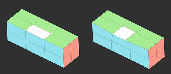 既存のポリゴンを横切るブリッジを作成することが簡単にできるため、不規則な望ましくないトポロジが出来てしまうこともあるので要注意