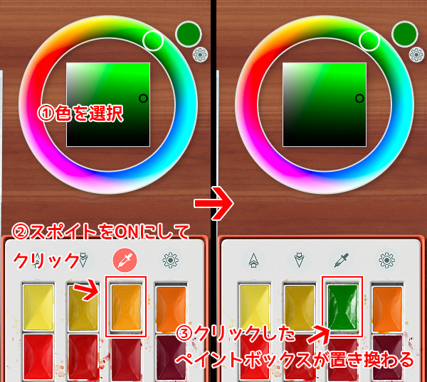 - パレット上部にあるスポイトボタンを押し、ペイントボックスのどこかをクリックする