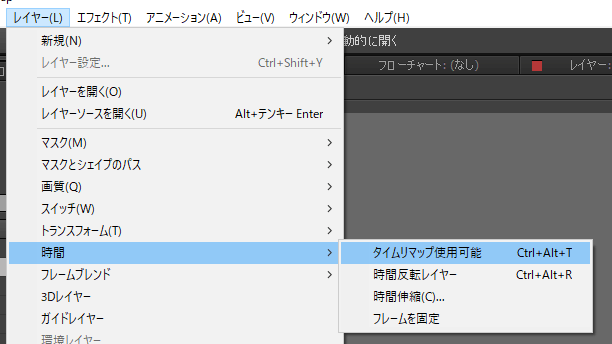 メニューからは「レイヤー>時間>タイムリマップ使用可能」