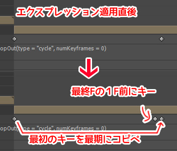メニューからアクセスするならエクスプレッション追加後、Property>loopOut(type = "cycle", numKeyframes = 0)