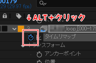 1. ALTを押しながら、タイムリマップのストップウォッチアイコンをクリックします。