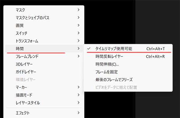 2. 右クリック > 時間 > タイムリマップ使用可能(CTRL+ALT + T)を適用