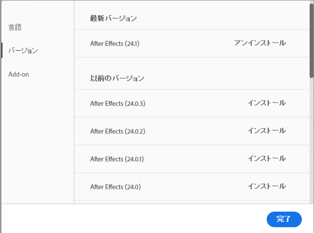 現在だとAfterEffects2024が最新なので、AfterEffects2024とAfterEffects2023のDLが可能です