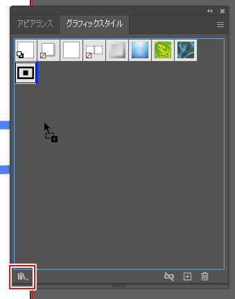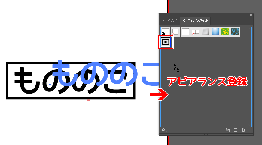 ウィンドウ>グラフィックスタイル(SHIFT+F5)にドラッグ&ドロップすることで、アピアランスを使いまわせます
