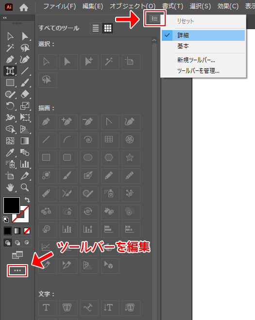 ツールバーを編集から個別に選択するか、詳細を選択するとメニューに表示されるようになります。