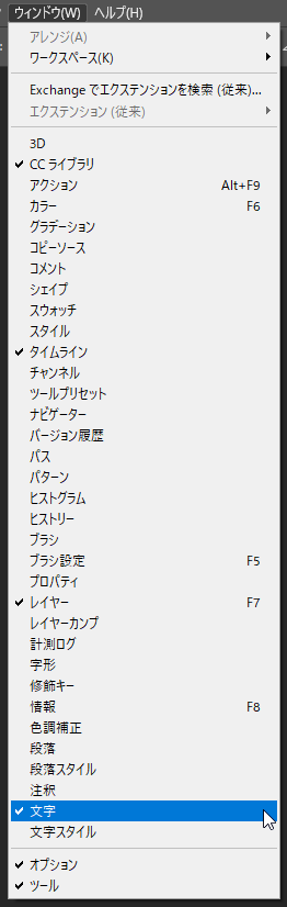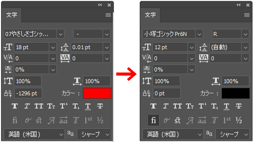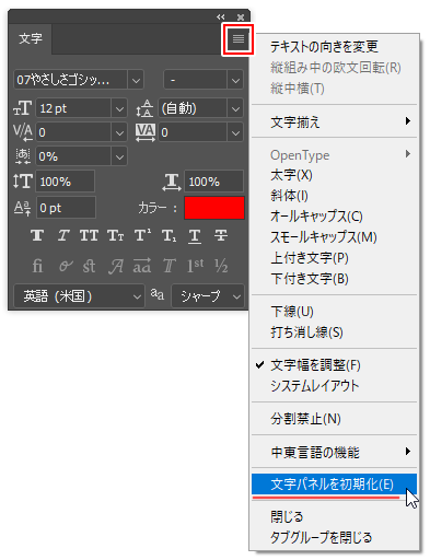 - 文字パネル右上の4本線をクリックし、文字パネルを初期化を選択します