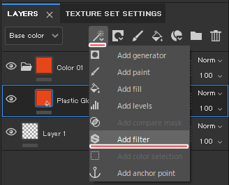 - Plastic Glossy Pureレイヤーを選択し、Add Effectボタンをクリックし、Add Filterを選択して、レイヤーにフィルター効果を適用します。