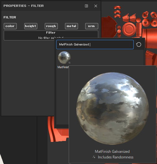 - Properties>Filter> Filterボタンを押し「MatFinish Galvanized」で検索し、フィルタを適用します。