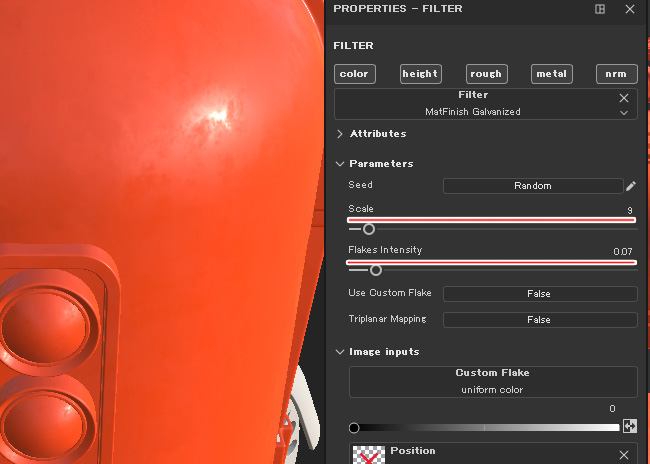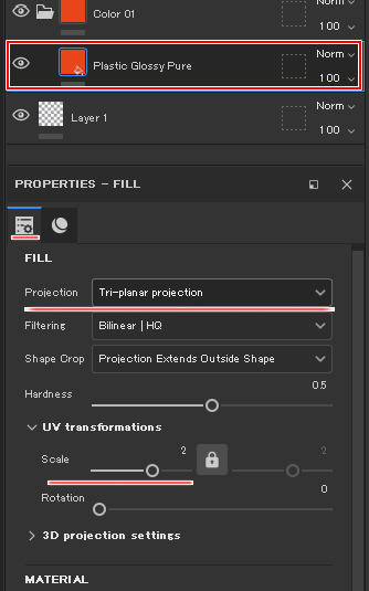 ・Plastic Glossy Pureレイヤーをクリックし、Properties-Fill>Projection>「Tri-planar projection」を選択します。・UV transformationsでScaleを2に変更します![]()