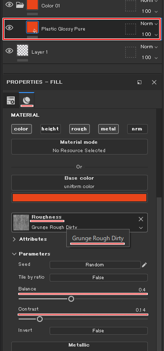 「Plastic Glossy Pure」レイヤーのRoughnessチャンネルに「Plastic Glossy Pure」Fillレイヤーを持たせマテリアルの光沢感にバリエーションを持たせていきます。