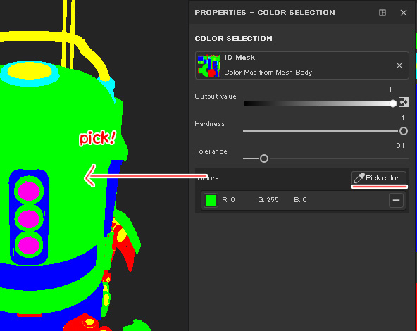 - そのままAdd Mask with Color Selectionが選択された状態で、Properties>Color Selection> Pick Colorボタンを押しメッシュ上の緑の色を選択してマスクを作成します。