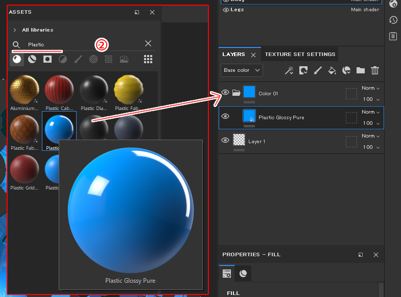 - Shelf>Materialsで「 Plastic」と検索し、フィルタリングされた結果から「Plastic Glossy Pure」マテリアルをシェルフからColor 01フォルダにドラッグします。これでレイヤースタックに Fill レイヤーが作成されます。