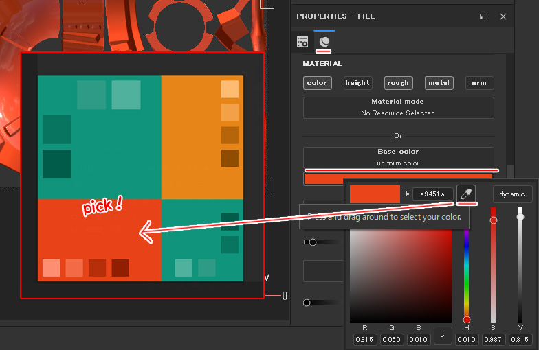 mocoSubstancepainterのウィンドウが最前面に表示されるため、テクスチャはSubstancepainterのウィンドウ外に配置し、カラーをピックしました