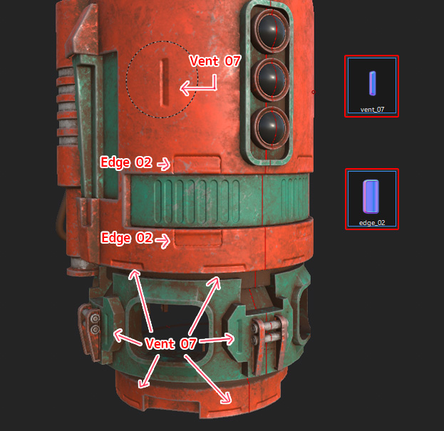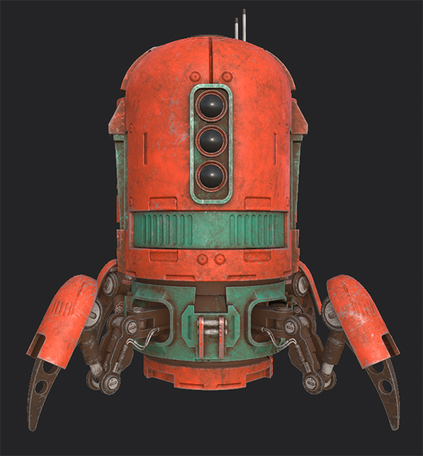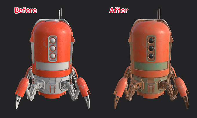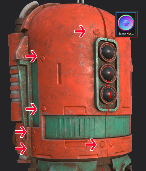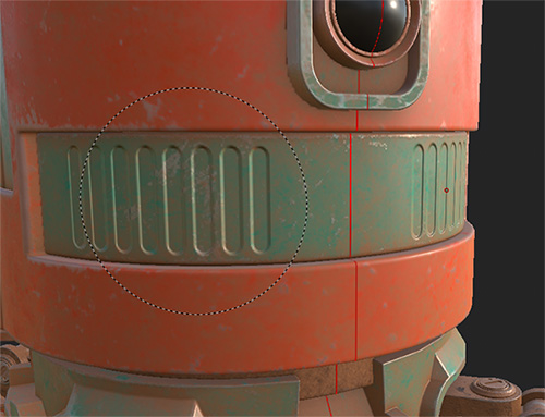 Substance Painterのブラシツールを使って、ロボットにさまざまなディテールを加えていきます。