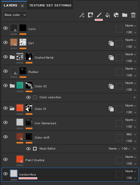 - レイヤービューの上部にあるAddLayerボタンをクリックして、レイヤーを新規作成します。レイヤをレイヤースタックの一番下にドラッグし、名前を 「hardsurface」 に変更します