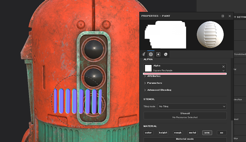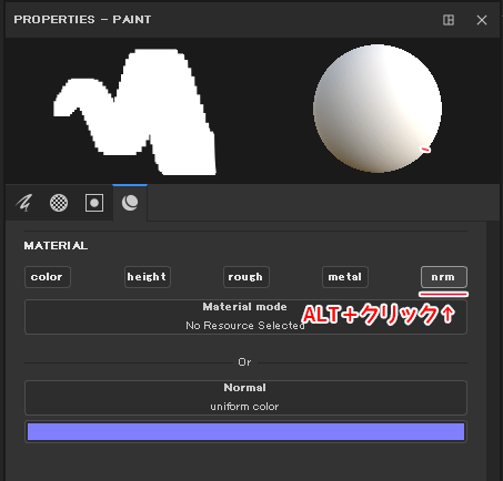 ※このアルファ削除の工程を行ったために以降のノーマルマップペイントの表示に不具合が起こりました。ここではアルファを「Square Rectangle」に変更してください- Properties-Paintで4番目のタブMaterialでNRM(ノーマル)チャンネルをAlt+左クリックします。これにより、NRMチャンネルがアクティブになり、ブラシマテリアルの他のチャンネルがすべて非アクティブになります。