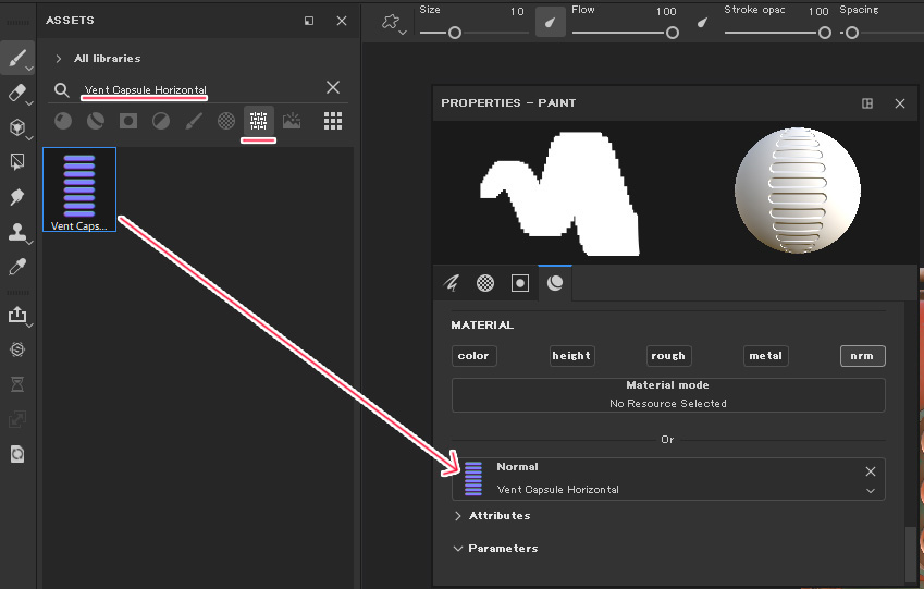 - シェルフでハードサーフェスのカテゴリーから「Vent Capsule Horizontal」を検索、 Vent Capsule Horizontalテクスチャを、ブラシマテリアルのプロパティのNormal入力チャンネルにドラッグします。