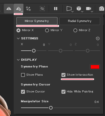 - シンメトリーの設定を行います。シンメトリーの右隣りのSymmetry settingsをクリックして、Mirror XとShow Intersectionが有効になっていることを確認します。