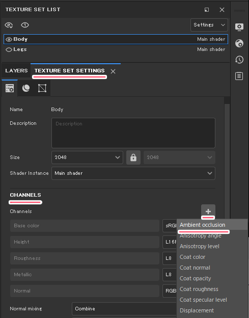 BodyとLeg両方のテクスチャセットにAmbient Occlusionチャンネルを追加します