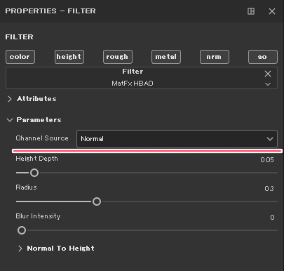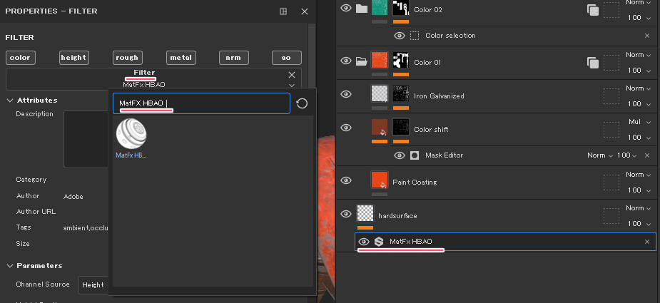 - hard surfaceレイヤーを選択した状態で、 Filter>Add Filterを選択し、Properties-Filterで「MatFX HBAO」フィルタを検索、レイヤーに適用します
