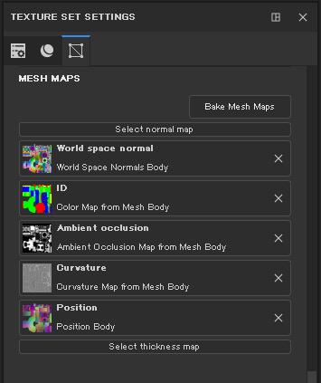 メッシュマップスロットは、Substance Painterの複数のフィルタで使用される特別なテクスチャを設定します、