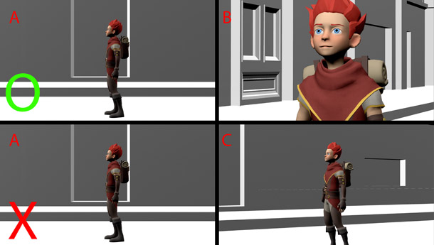 正しいカメラ配置は、観客がシーンのどこにいるのか、どの方向を見ているのか、どの方向に動いているのかがわからなくなるのを防ぐぎます。