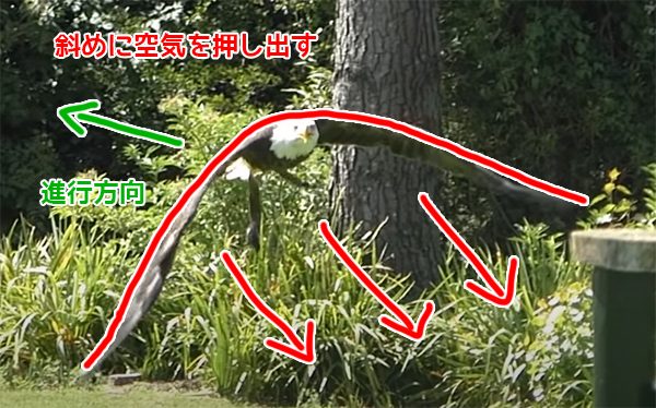 - ブレーキをかけるため翼を前に扇いでる