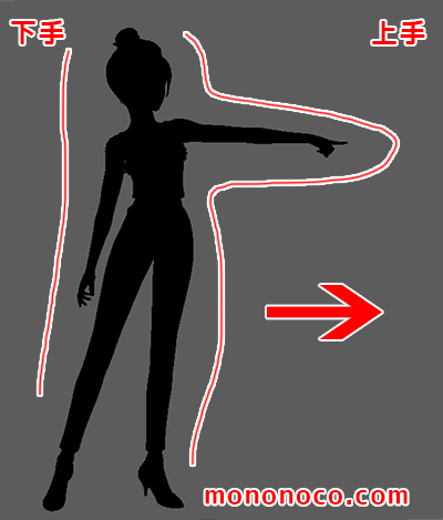 HOW=上手側を強調するために、下手側のシルエットはシンプルにする