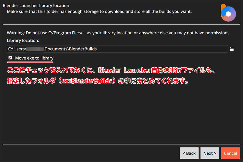 Blenderのビルドを保存する場所を選択してください - どのフォルダに収納するのか聞かれるので選択します。