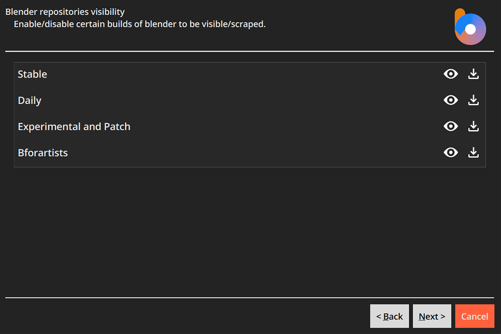特定のBlenderビルド(バージョン)を表示/非表示、情報を取得するかを有効・無効にします。-