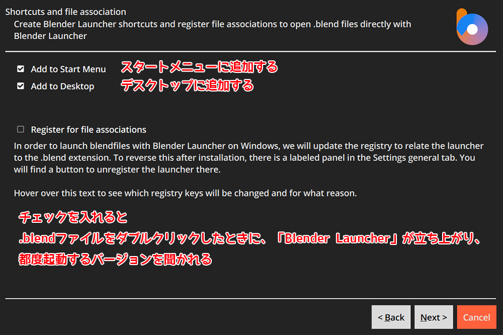 Blender Launcherのショートカットを作成し、.blendファイル(Blenderのデータファイル)をBlender Launcherで直接開けるように関連付けを行います。□Add to Start Menu スタートメニューに追加する
