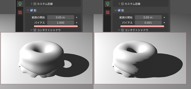 - ライトの調整。ライトを選択し、オブジェクトデータプロパティ>バイアス