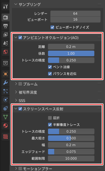 - レンダープロパティ>アンビエントオクルージョンにチェックを入れる