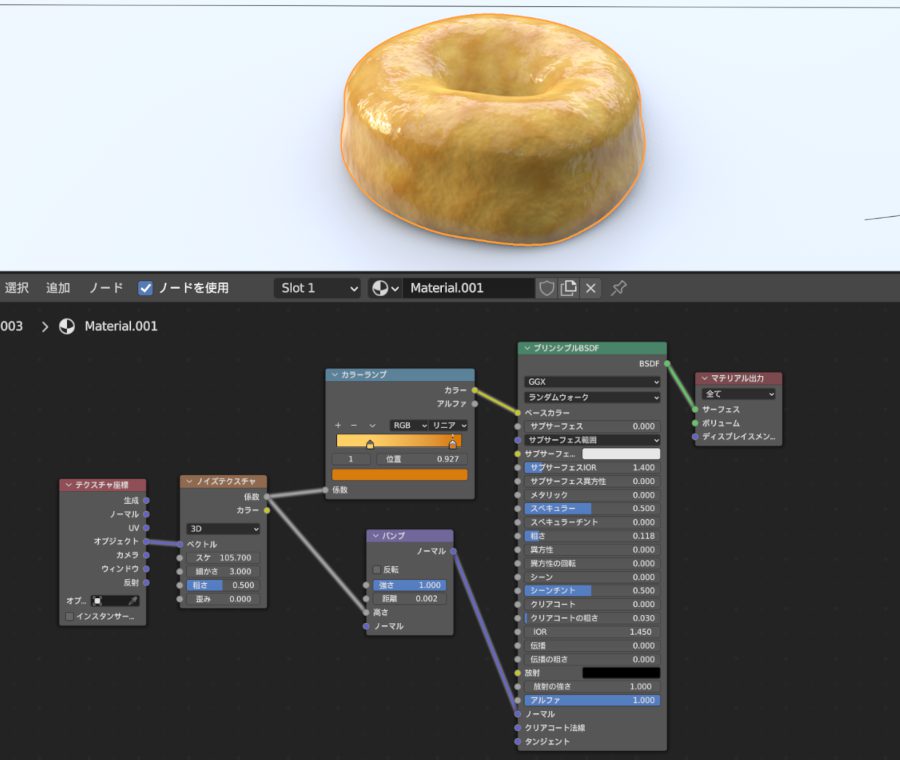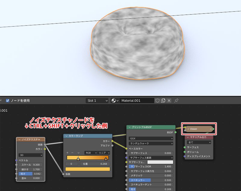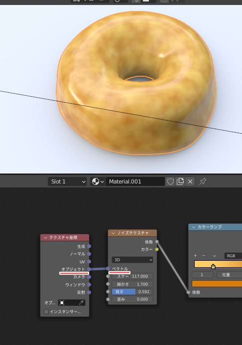 そこでテクスチャの適用方法を変更します。追加>入力>テクスチャ座標ノードを追加し、ノイズテクスチャのベクトルをテクスチャ座標のオブジェクトに接続します。