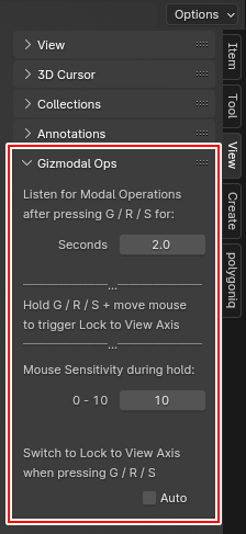 サイドバー(Nキー)> View > Gizmodal Ops