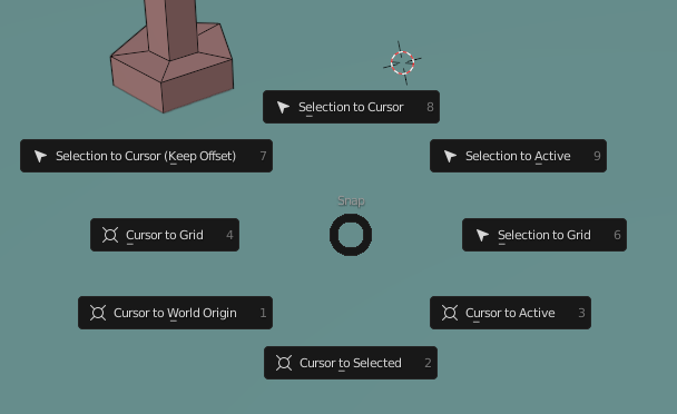 SHIFT+Sで3Dカーソルに関わる各種設定が出てきます。