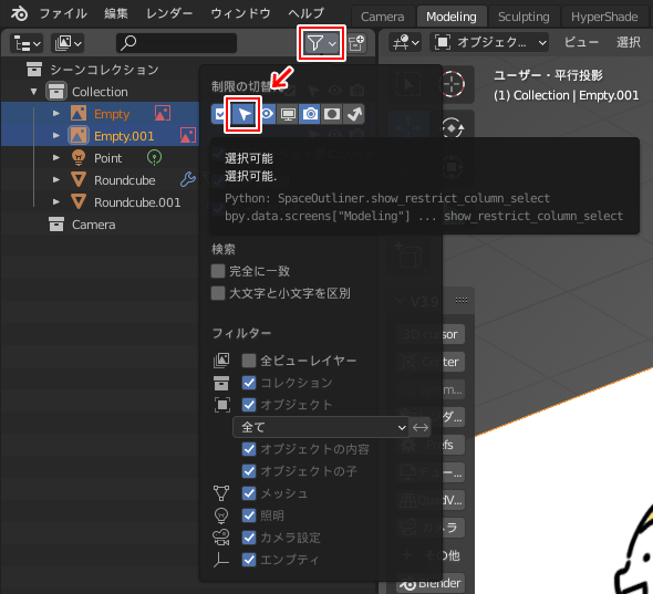 アウトライナーからフィルター>制限の切り替え:選択可能をONにします