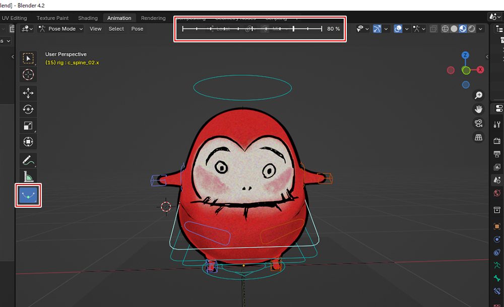 リグを選択、ポーズモードに入ると自動で表示される機能で、スライダーをもってキーフレームとキーフレームの間のブレイクダウン ポーズを作成します。